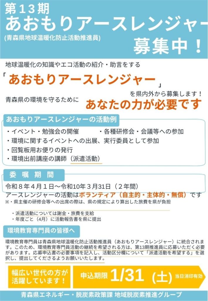 - 第13期あおもりアースレンジャーの募集が始まりました!青森県では、地球温暖化の知識やエコ活動の紹介・助言をする「あおもりアースレンジャー」(青森県地球温暖化防止活動… 続きを読む: 第13期あおもりアースレンジャーの募集が始まりました!
