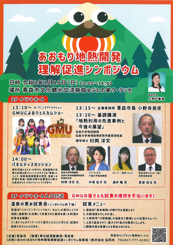 あおもり地熱開発理解促進シンポジウム 2020年1月27日 最終更新日時 : 2025年11月1日 kankyo-partnership 現在、青森市の八甲田地区では、地熱発電に向けた調査が行われています。地熱発電の仕組みやメリット、温泉資源との両立等を市民の皆さんと共に考えるシンポジウムを開催します。 ご当地アイドルユニット「G.M.U」によるクイズなどを交えながら、楽しく地熱を学びましょう。詳しくは主催団体にお問い合わせください。