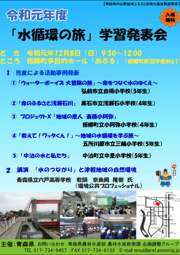 「水循環の旅」学習発表会 2019年11月30日 最終更新日時 : 2025年11月1日 kankyo-partnership 12月8日(日)、板柳町「あぷる」で「水循環の旅」学習発表会を開催します。 前半は津軽地域の小学生が水循環について学習した成果を発表します。 後半は「水のつながり」と津軽地域の自然環境と題して、県立六戸高校教頭の奈良岡隆樹氏(環境公共プロフェッショナル)の講演があります。お問い合わせは青森県農林水産部 農林水産政策課まで。メール:nosui@pref.aomori.lg.jp