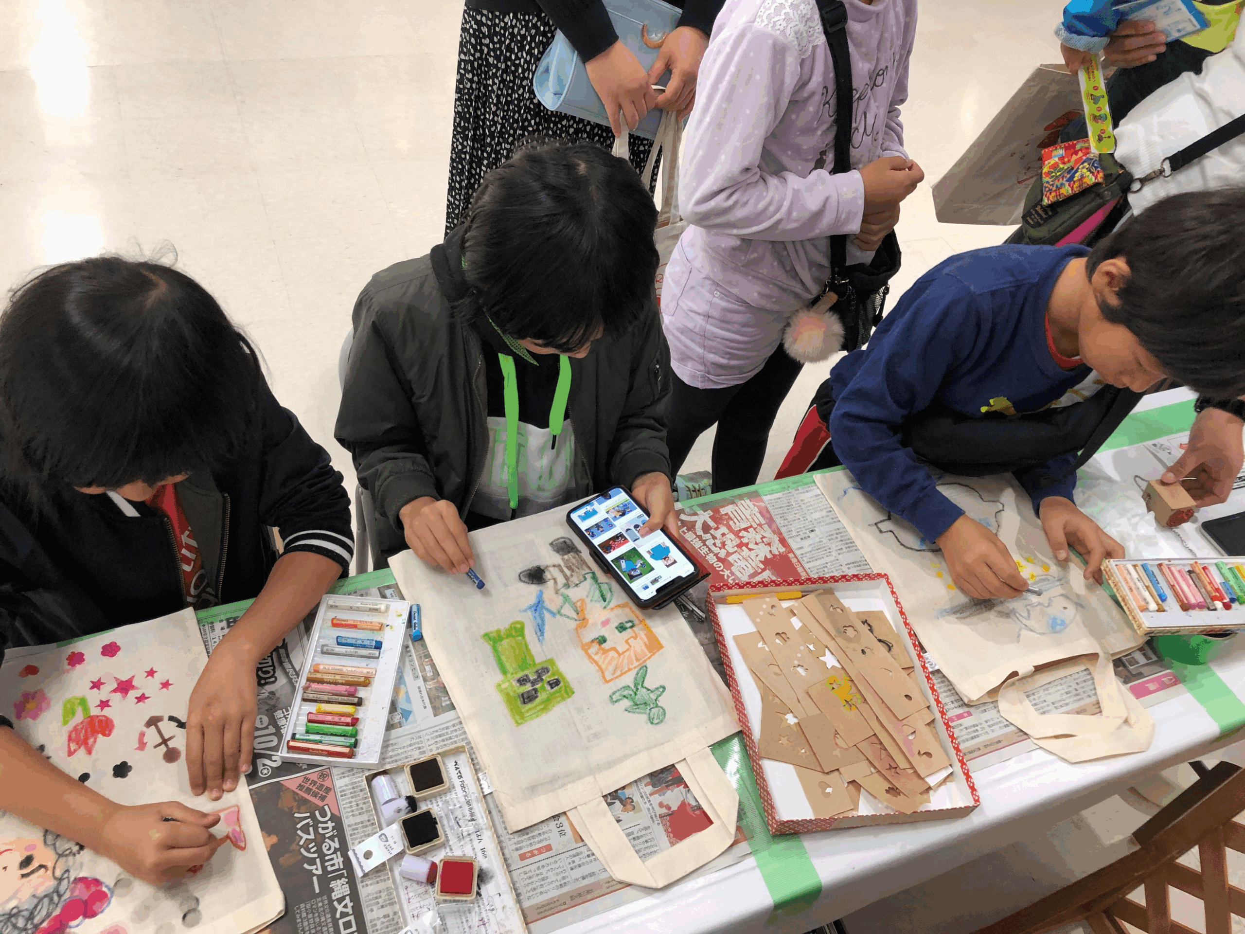 子ども達に人気だったのは、ミニエコバッグにステンシル体験でした。クレヨンで自由に描いた絵が模様になる世界で1つだけのマイバッグづくりは、子ども限定にもかかわらず、用意した枚数はあっという間になくなってしまいました。