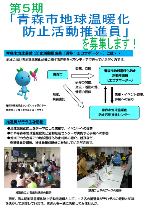 青森市では第5期青森市地球温暖化防止活動推進員(以下エコサポーター)を募集しています。