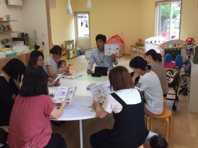 子育て中のお母さん7名と赤ちゃんが、ねぶた師の北村麻子さんがガイドする「エコ活!応援BOOK」をテキストに、アースレンジャーの山本泰二さんが講師となって“今すぐ”できる、“誰でも”できる、環境に優しい暮らしの工夫について学びました。