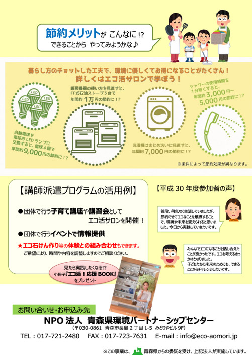 エコ活サロンは子育て中のお母さんを対象にした、環境ミニ講座です。体験との組み合わせもできます。県内どこでも開催できます。希望の方はお問い合わせください。