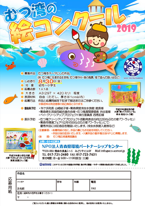 むつ湾の絵コンクール2019作品募集中 2019年7月9日 最終更新日時 : 2025年11月1日 kankyo-partnership 恵み豊かなふるさとの海「むつ湾」の自然を守るには、沿岸に暮らす私たちがむつ湾を知り、身近に感じ、楽しむことが大切です。 今年もむつ湾の生き物、むつ湾で遊ぶ、むつ湾で働く、いろいろなむつ湾をテーマにした絵を募集します。 夏休みの思い出に、海の絵を描いて送ってください。