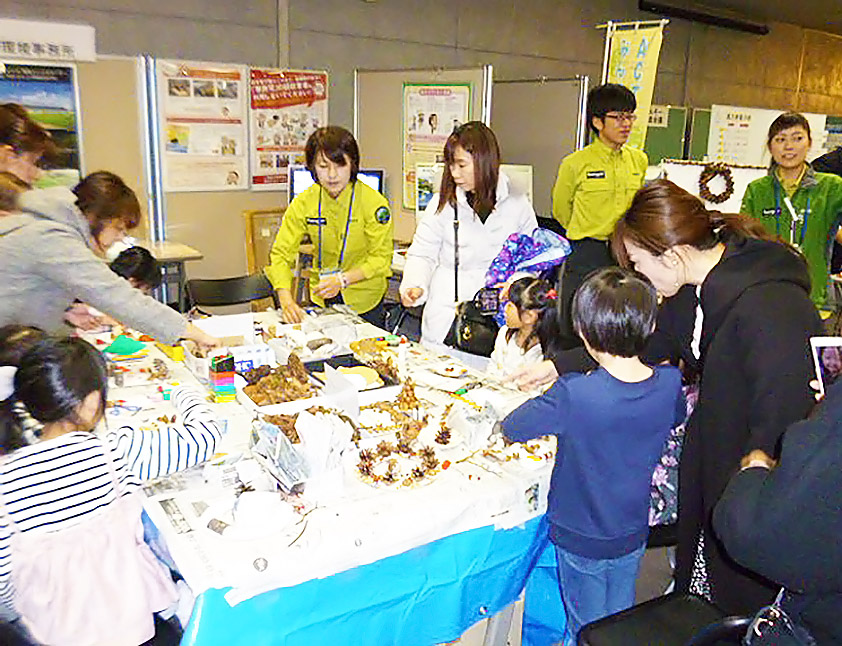 今回は、エコ検定に関するブースや、世界のトイレ事情に関するパネルなど、新しい取り組み紹介もあり、市民の関心を集めていました。今回も青森市民のゴミを活用して作った肥料で育ったジャガイモのプレゼントや、県産材を使った積み木や、木の実のリース作りなど盛りだくさんの内容で、参加者はそれぞれに楽しみました。