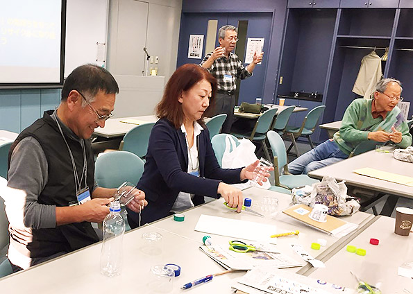 最初に白川直人推進員(むつ市)がエコカーリングを、続いて貝森毅彦推進員(青森市)がペットボトルけん玉を、参加者と一緒に作りました。 参加した推進員たちは、小学生になったつもりで工作に参加して、「意外と難しいぞ」、「これは楽しい」といった感想を述べていました。