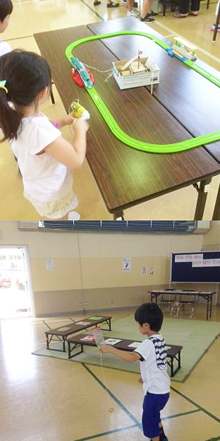 9月3日、4日北部市民センターにて「見る・聞く・体験 まるごとエコまつり!」に参加しました。当センターブースでは、手回し発電で電車を走らせたり、廃油でせっけん作り、ペットボトルでけん玉、ボスターで作る紙袋などを作り体験してもらいました。