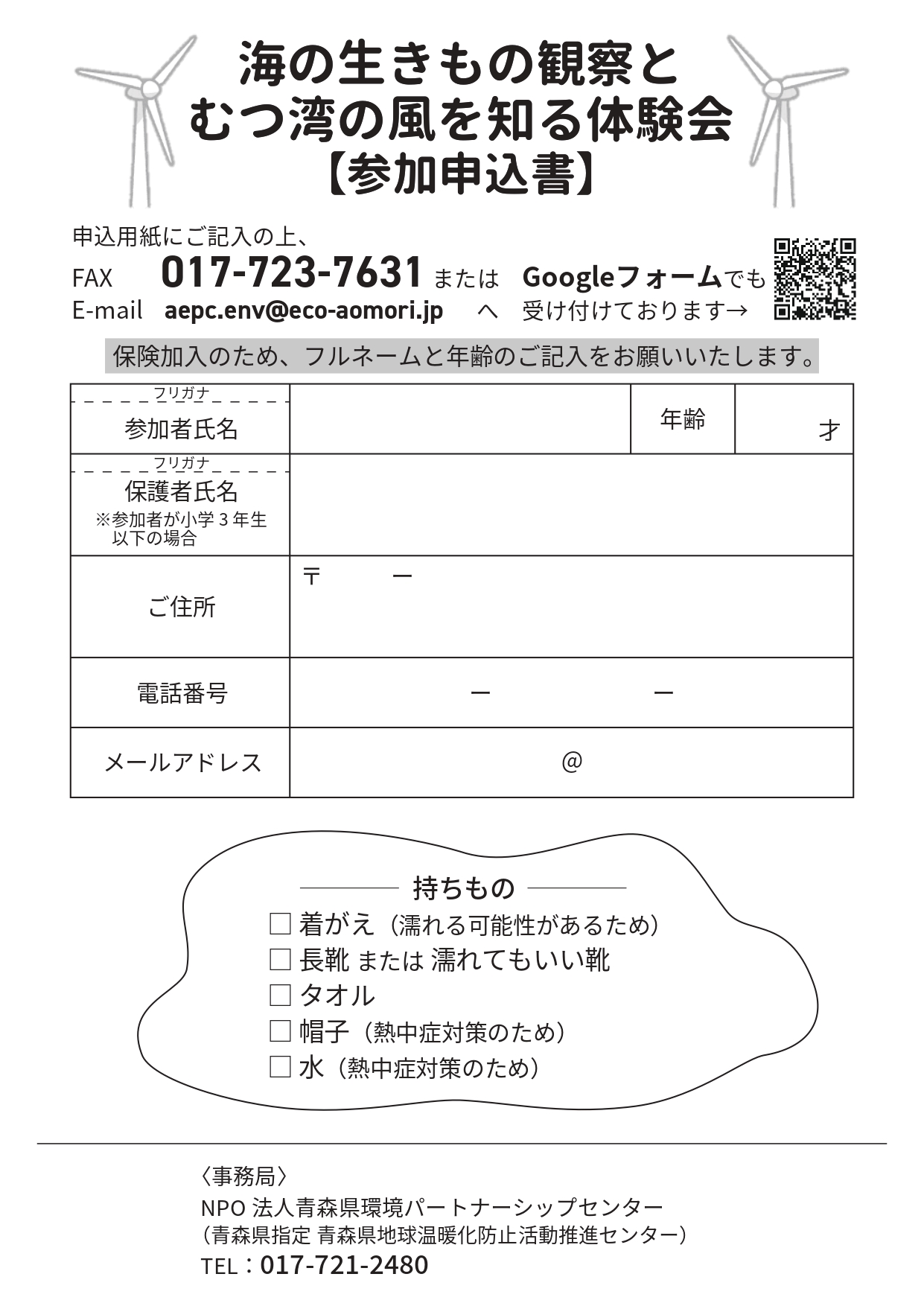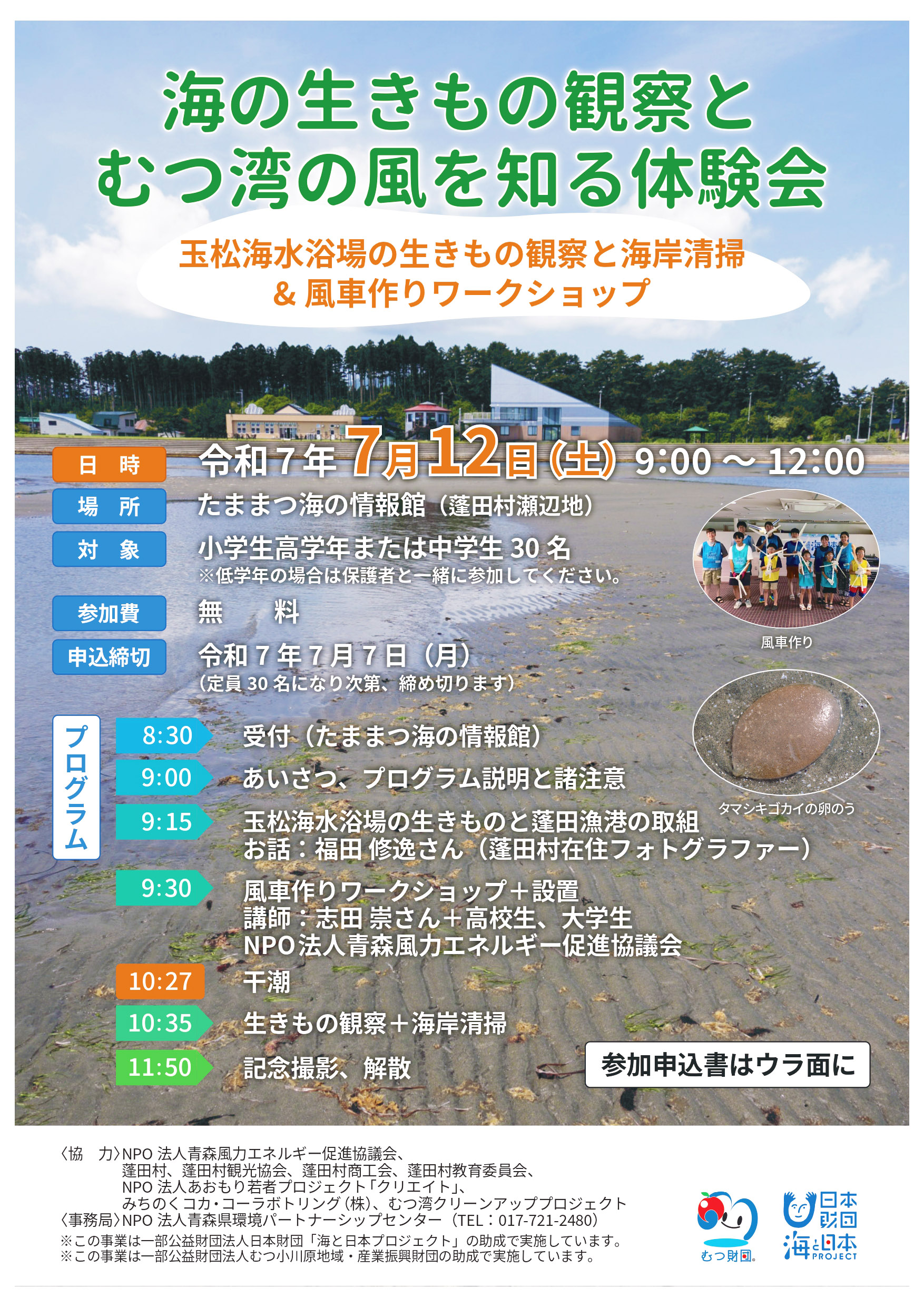 「海の生きもの観察とむつ湾の風を知る体験会」参加者募集中! 2025年7月2日 最終更新日時 : 2025年8月29日 kankyo-partnership 令和7年7月12日(土)、たままつ海の情報館(蓬田村玉松海水浴場)にて、生きもの観察と海岸清掃、風車作りワークショップを実施します。皆様のご参加お待ちしております。詳しくはチラシをご確認ください。