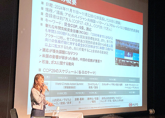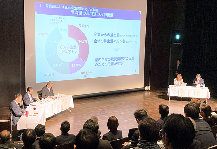 「中小企業のためのESG金融・脱炭素経営セミナーin青森」を開催しました 2025年1月26日 最終更新日時 : 2025年8月29日 kankyo-partnership 1月17日(金)、ねぶたの家ワ・ラッセにて「中小企業のためのESG金融・脱炭素経営セミナーin青森」を開催し、県内外から100人を超える参加がありました。参加者は、脱炭素社会における企業のあり方についての吉高まり様(三菱UFJリサーチ&コンサルティング株式会社 フェロー〈サステナビリティ〉)の基調講演やパネルディスカッションに耳を傾けました。 はじめに情報提供(藤野純一さん) 基調講演(吉高まりさん) パネルディスカッション 会場の様子