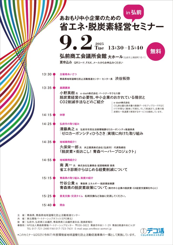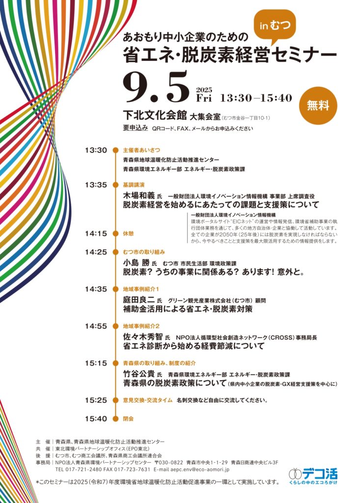 「あおもり中小企業のための省エネ・脱炭素経営セミナー」を開催しました 2025年9月16日 最終更新日時 : 2025年10月21日 kankyo-partnership 9月2日(火)に弘前市、9月5日(金)にむつ市で、「あおもり中小企業のための省エネ・脱炭素経営セミナー」を開催し、弘前市では27人、むつ市では20人にご参加いただきました。一般財団法人環境イノベーション情報機構の木場和義氏などにご登壇いただき、脱炭素経営の必要性や工夫を発表していただきました。