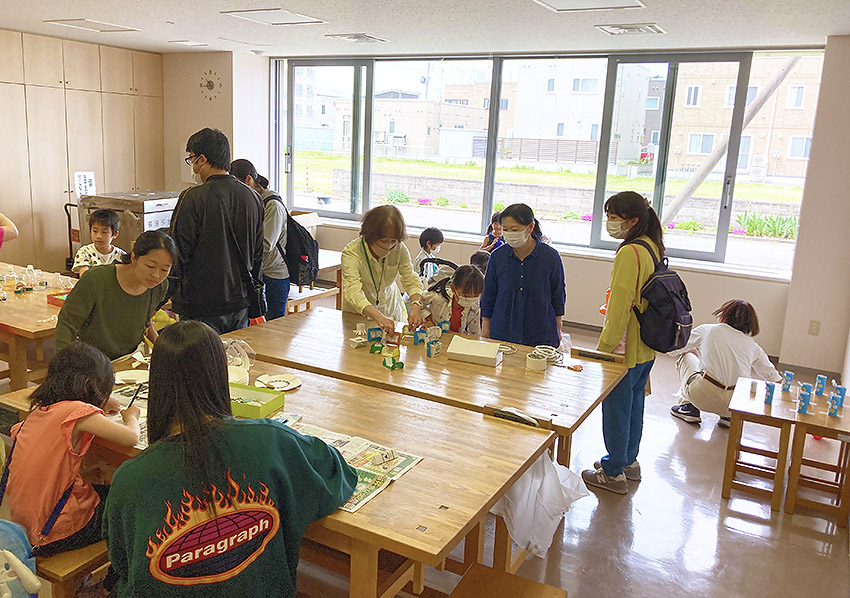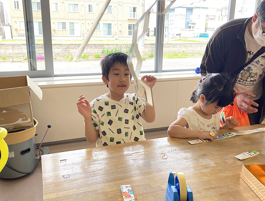 当センターでは、牛乳パックと輪ゴムでつくる「びっくり箱」、ペットボトルの再活用「ボウリング」や「けん玉」を作ってチャレンジ、紙皿ブーメランにお絵描きして飛ばすコーナーなど、交替しながらの体験で大盛況でした。 「むつ湾かるた」コーナーでは、大人も子どもも一緒になって大盛り上がり!