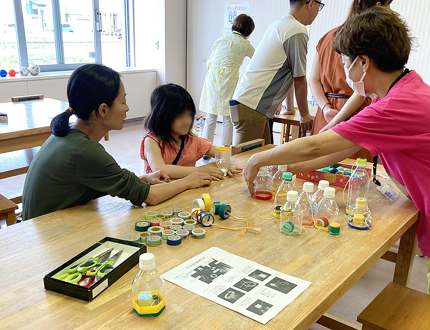 (左)全体の様子 (右)ペットボトルのけん玉