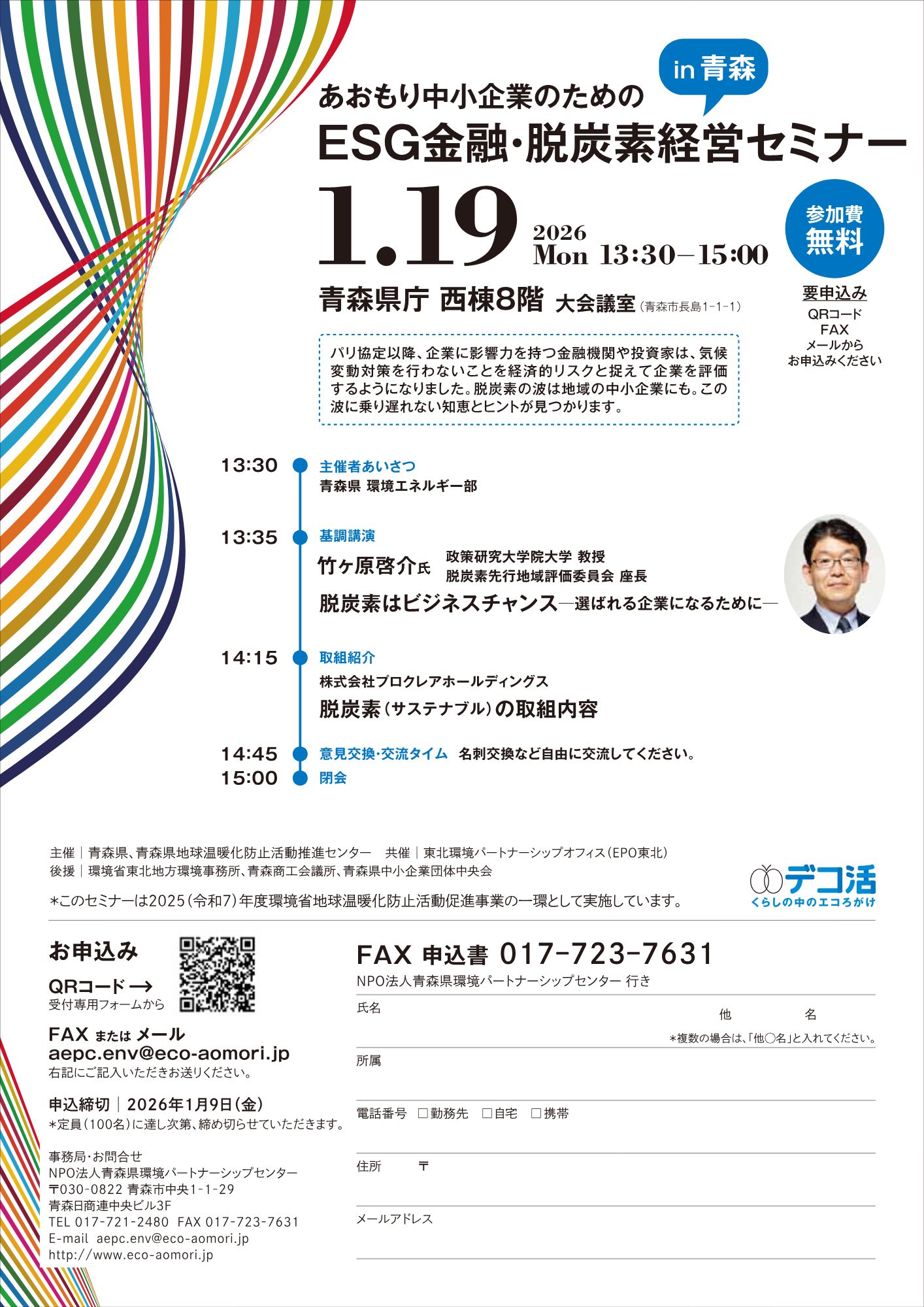 あおもり中小企業のためのESG金融・脱炭素経営セミナーin青森 2025年12月10日 最終更新日時 : 2025年12月11日 kankyo-partnership 世界は脱炭素に向かって動き始めました。この社会の流れを、さまざまな角度から学びます。地域の事例紹介もあります。ぜひご参加ください。