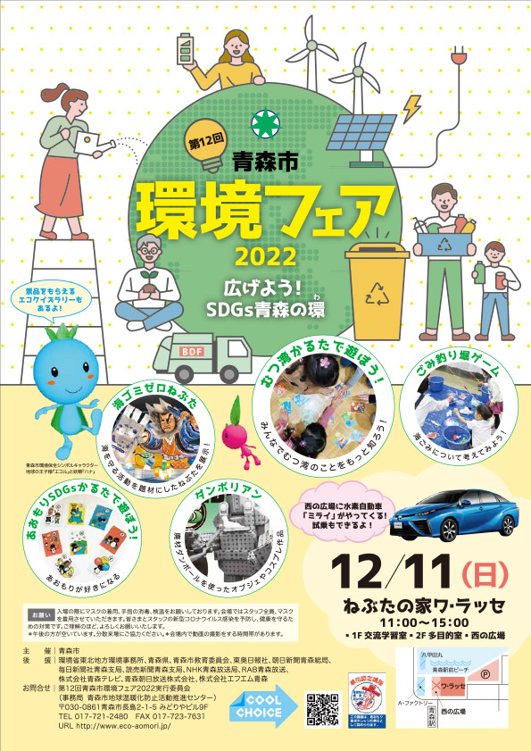 第12回青森市環境フェア2022 2022年11月4日 最終更新日時 : 2025年10月23日 kankyo-partnership 「広げよう!SDGs青森の環」をテーマに、今年も青森市環境フェアを開催します。ご家族みんなでおいでください。*当日はマスク着用、体温測定にご協力ください。*午後が空いています。分散来場にご協力ください。