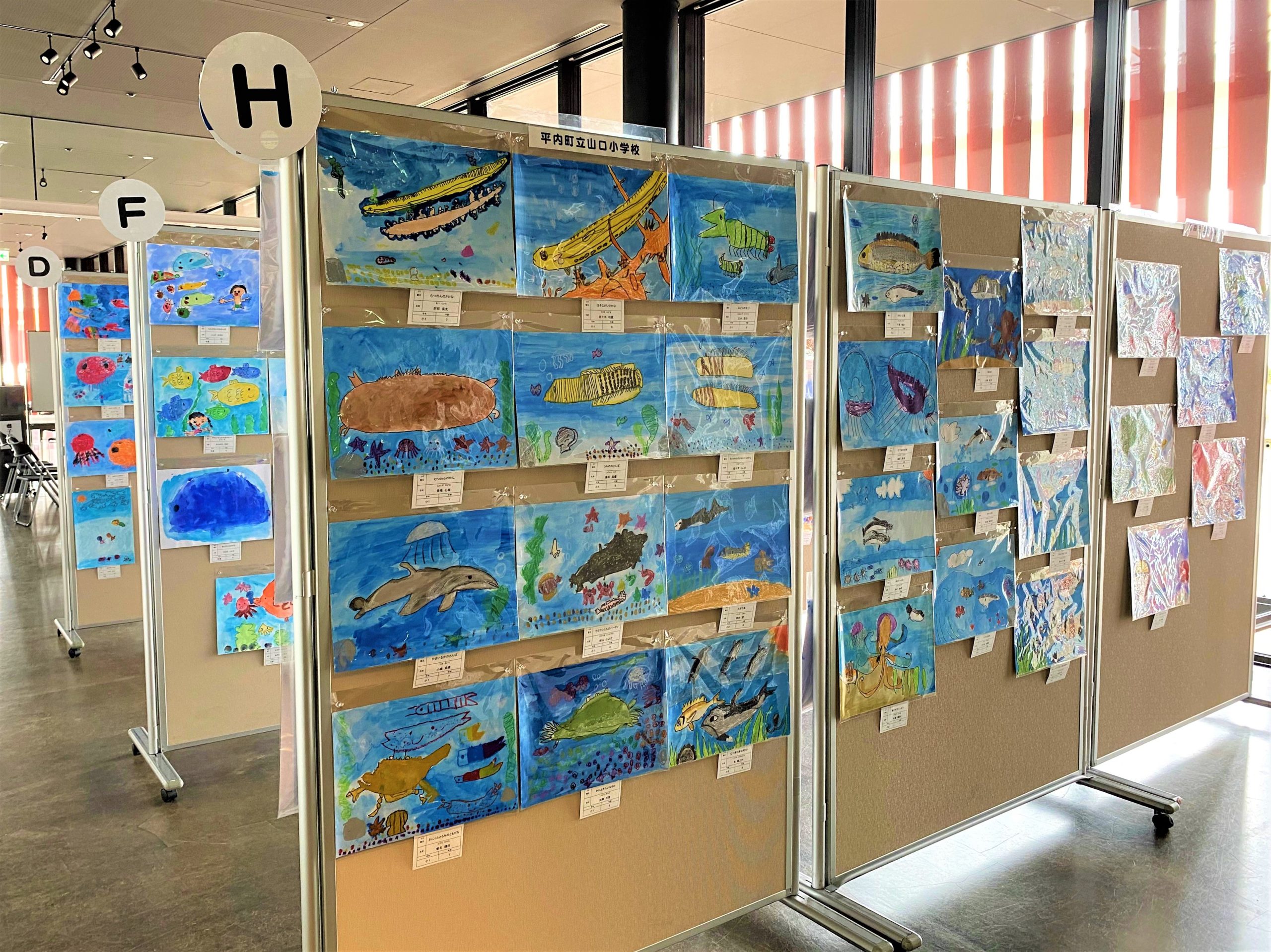 (左)全応募207作品を展示(右)むつ湾の絵コンクール表彰式