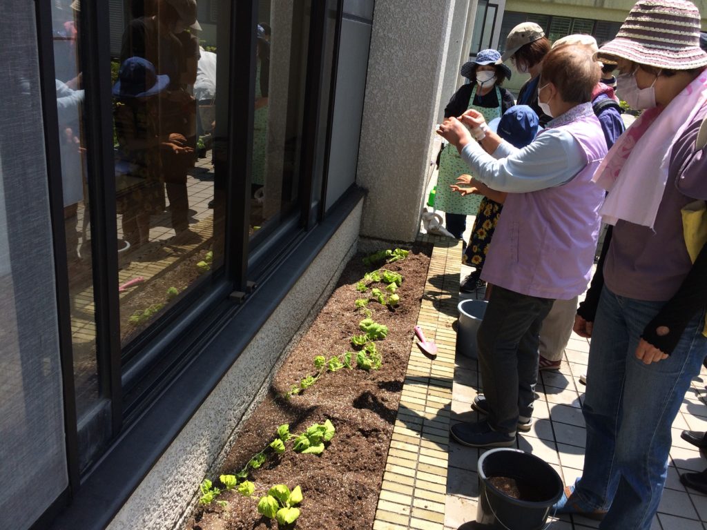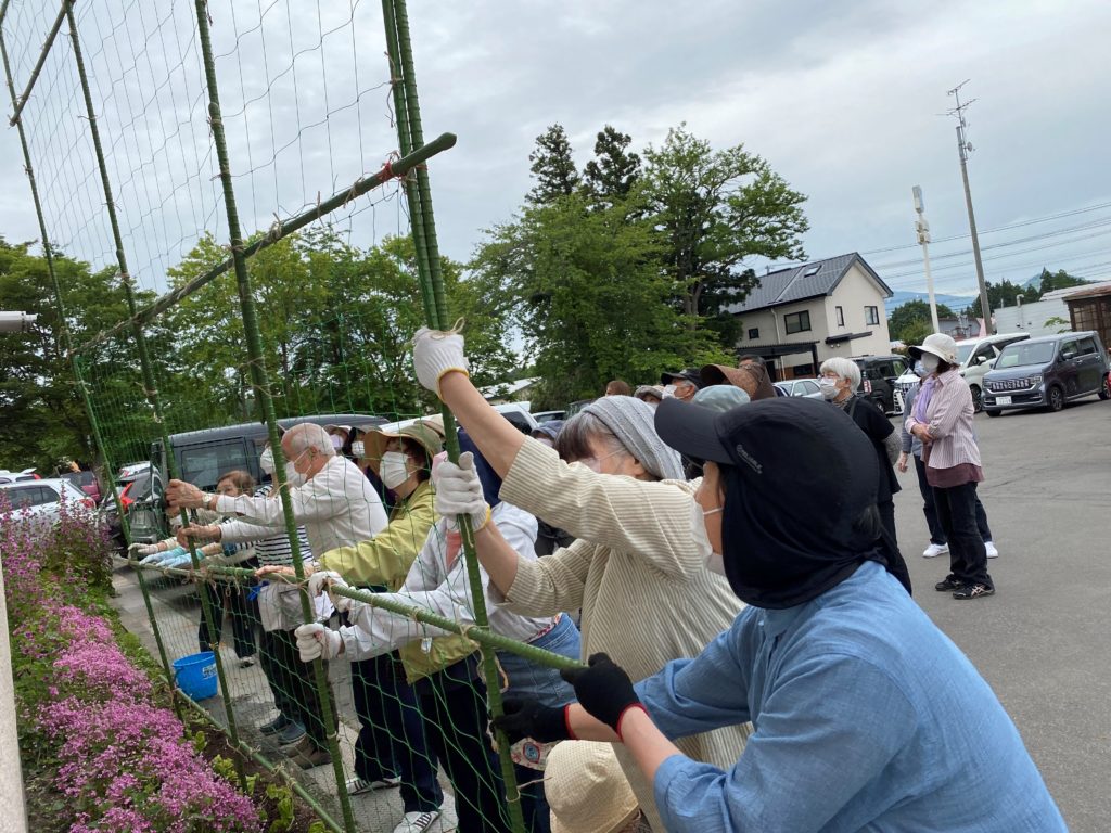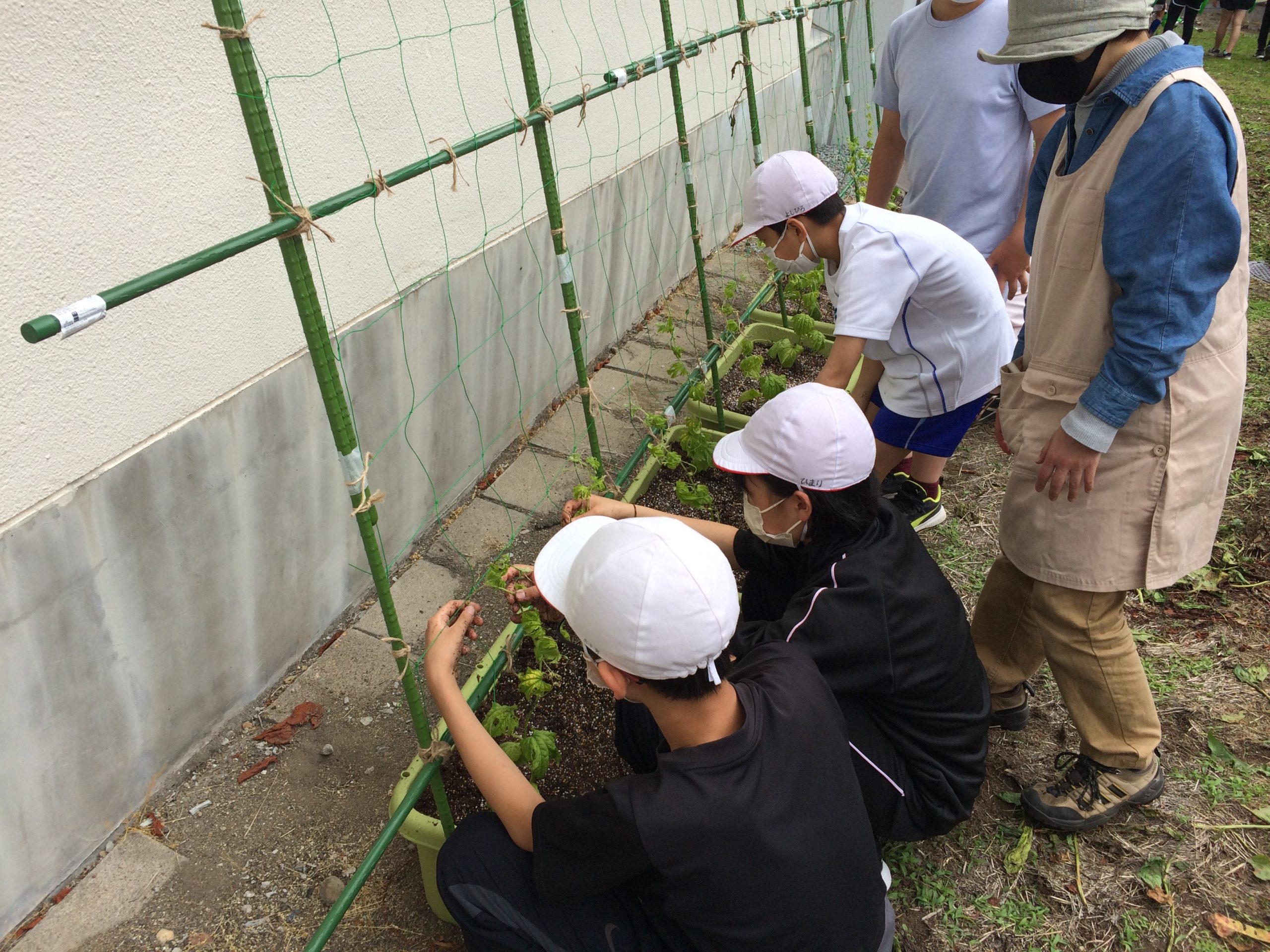 橋本小学校では5年生と6年生12名が参加し、ネットの組み立てと苗の植え付けを体験しました。(写真3)