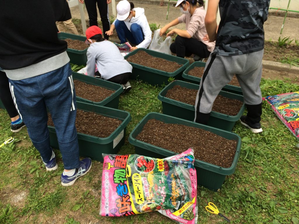 (右)プランターに土を入れよう(堤小学校)