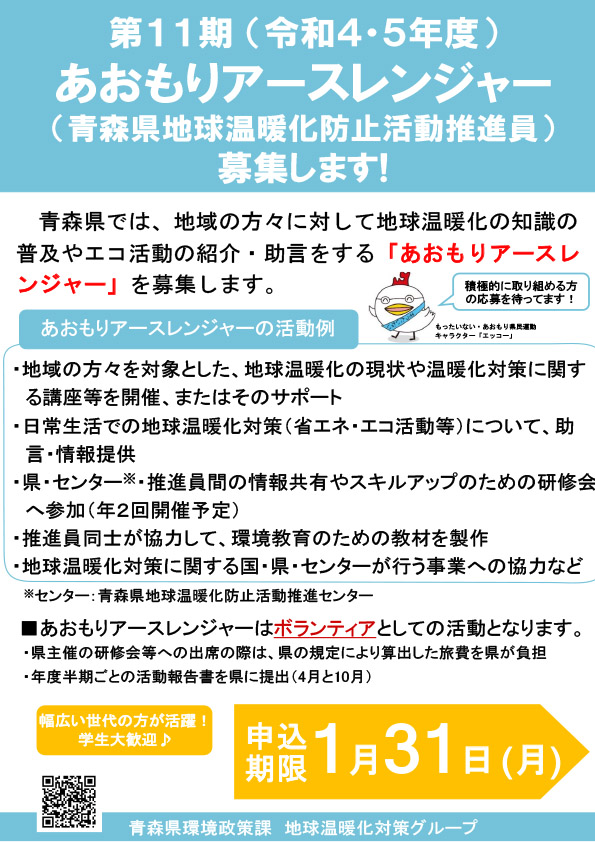 アースレンジャー(青森県地球温暖化防止活動推進員)募集中! 2021年12月9日 最終更新日時 : 2025年10月24日 kankyo-partnership あおもりアースレンジャーは、地域の方々を対象とした地球温暖化に関するセミナーの開催やエコ活動等の企画・運営を通じて、日常生活での省エネやエコ情報を提供・助言するボランティアです。一緒に活動しませんか。
