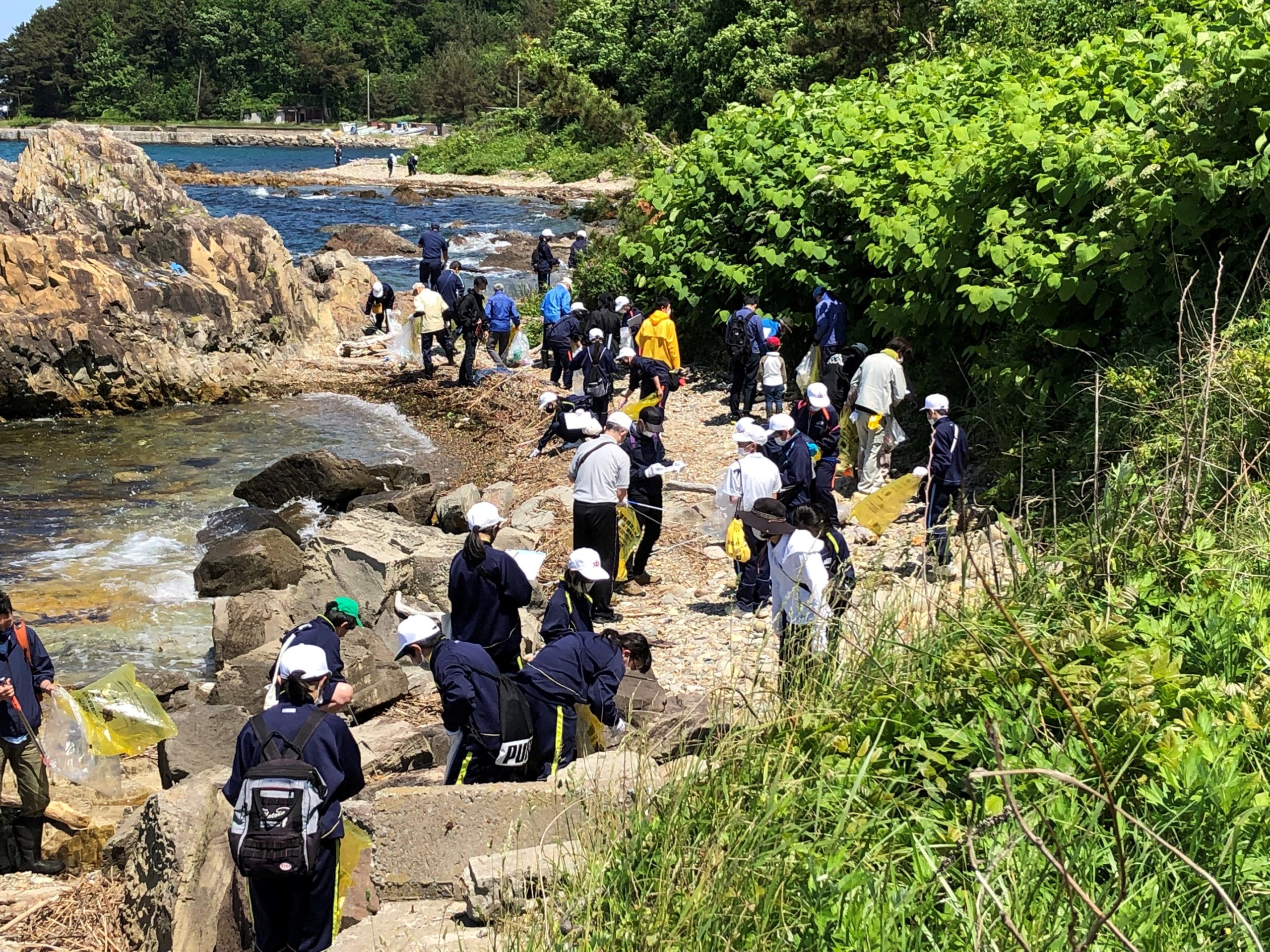 むつ湾週間となった初めての週末6月5日、青森市立東中学校の生徒さんと地域の皆さんが揃って浅虫海岸の清掃を行いました。