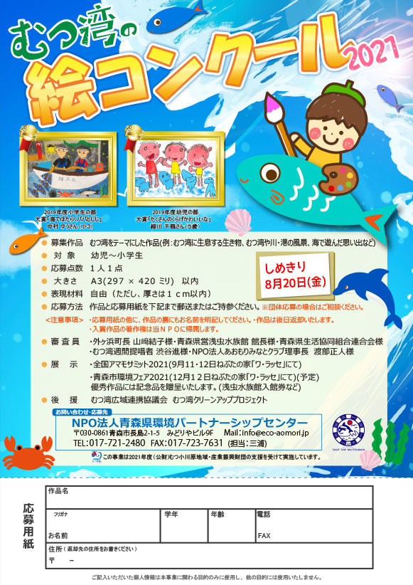 青森市では、6月1日から21日までを「むつ湾週間」と定めています。これを記念して、「むつ湾の絵コンクール」を実施してきましたが、昨年はコロナ禍のためお休みしました。でも、今年は実施します。今年も、大賞受賞者には青森県営浅虫水族館のペア入館券が、準大賞受賞者にはcoopのエコ商品などが贈られます。