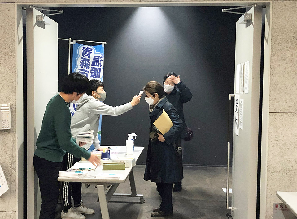 (左)青大SDGs研究センターで質問する人(右)人気のアマビエコーナー