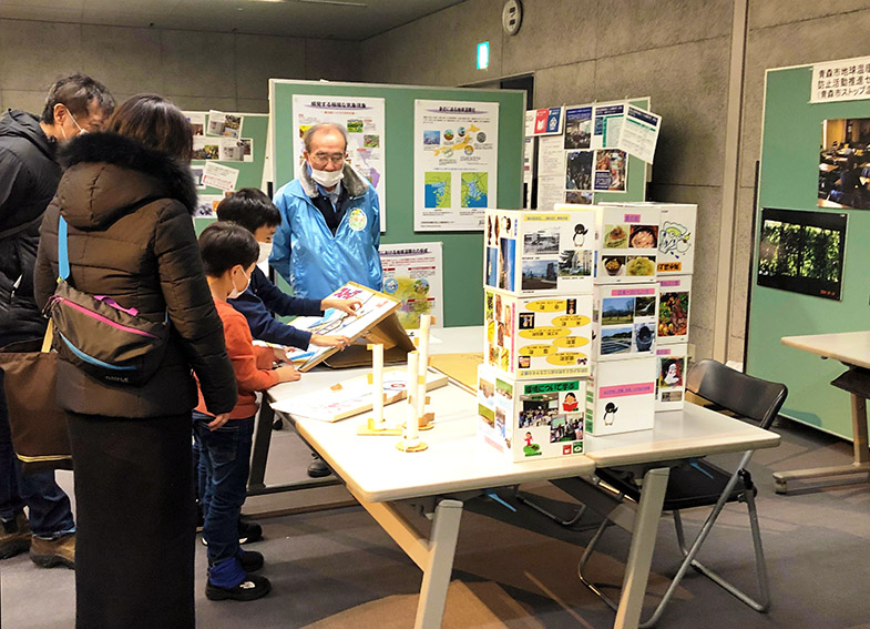 青森市環境保全活動団体表彰や1F交流学習室での展示、2F多目的室での体験、環境配慮機器の展示などが行われました。