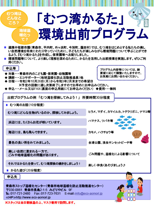 「むつ湾かるた」はむつ湾沿岸の自然や生き物を読み込んだ、5~8歳向けの環境教育教材で、青森圏域連携中枢都市圏が制作しました。