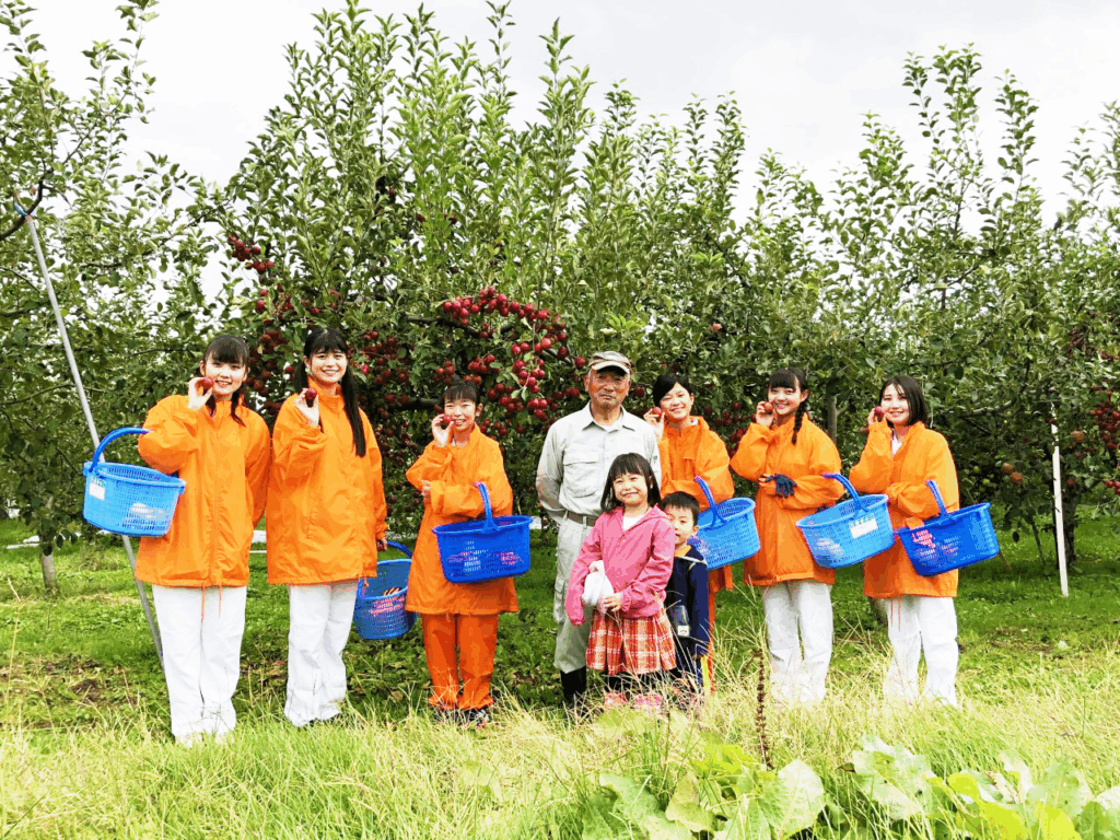 ご当地アイドルの「アルプスおとめ」のみなさんが、勝じいのりんご園で小さいリンゴ品種「アルプス乙女」を収穫しました。