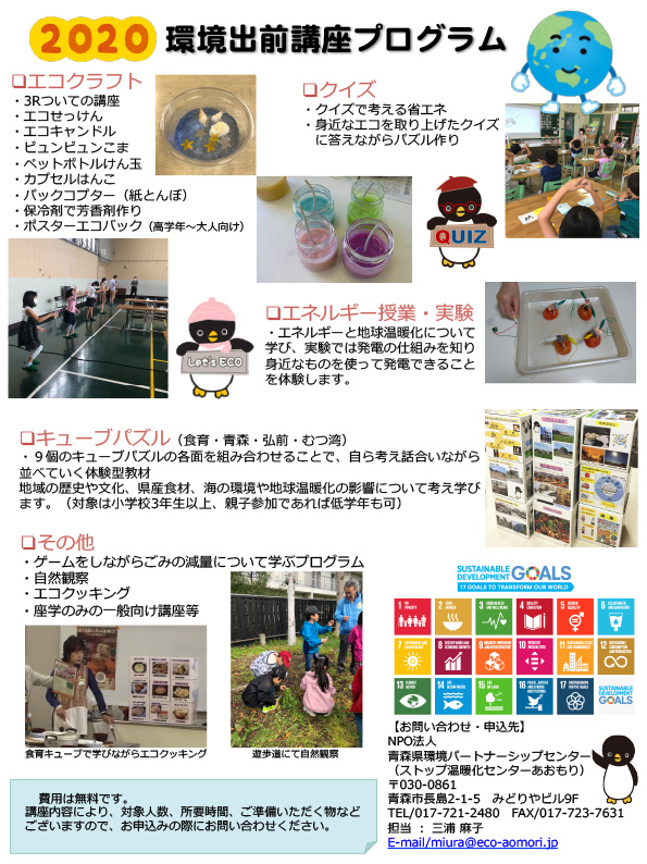 あおもりアースレンジャーによる子どもかんきょう講座のご案内 2020年9月8日 最終更新日時 : 2025年11月1日 kankyo-partnership 青森県地球温暖化防止活動推進センターでは、小学生以上の子ども達を対象にした子どもかんきょう講座を実施しています。放課後児童会や子ども会活動などでご活用ください。県内どこでも無料です。